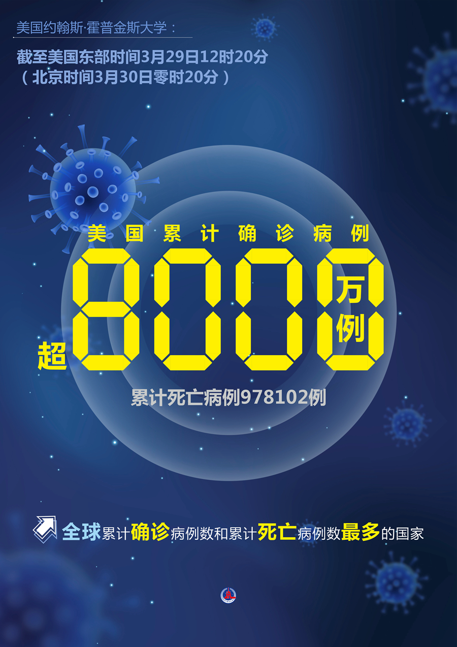 紐約3月29日電 美國(guó)約翰斯·霍普金斯大學(xué)29日發(fā)布的新冠疫情最新統(tǒng)計(jì)數(shù)據(jù)顯示,美國(guó)累計(jì)確診病例超過(guò)8000萬(wàn)例。